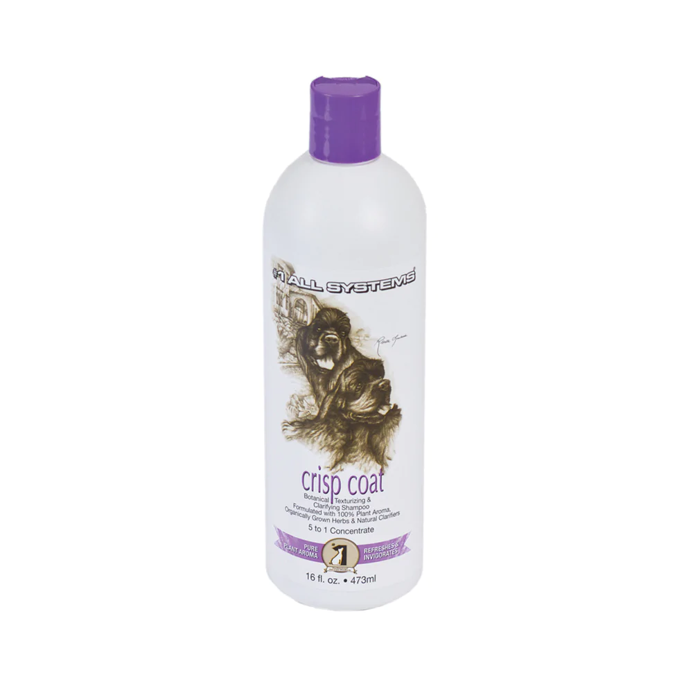 Sampon Crisp Coat creat special pentru câinii cu blana tare și/sau aspră, cum ar fi: Terrier, Collie, Chow Chow, Pomeranian, Akitas și altele asemenea, unde textura și volumul sunt esențiale pentru prezentare și standardul rasei. Șamponul Crisp Coat este bogat în substanțe botanice pentru îmbunătățirea texturii și eliminarea reziduurilor. Este realizat cu toate ingredientele botanice naturale pentru purificarea pielii și părului, cum ar fi eucalipt, rozmarin și mentă. Îndepărtează eficient clorul și mineralele grele de pe piele și blană. Șamponul Crisp Coat este sigur chiar și pentru cele mai fragile blanuri.